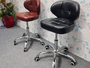 Ghế có piston lên xuống được. Châm mạ crom, có bánh xe nhựa di chuyển.